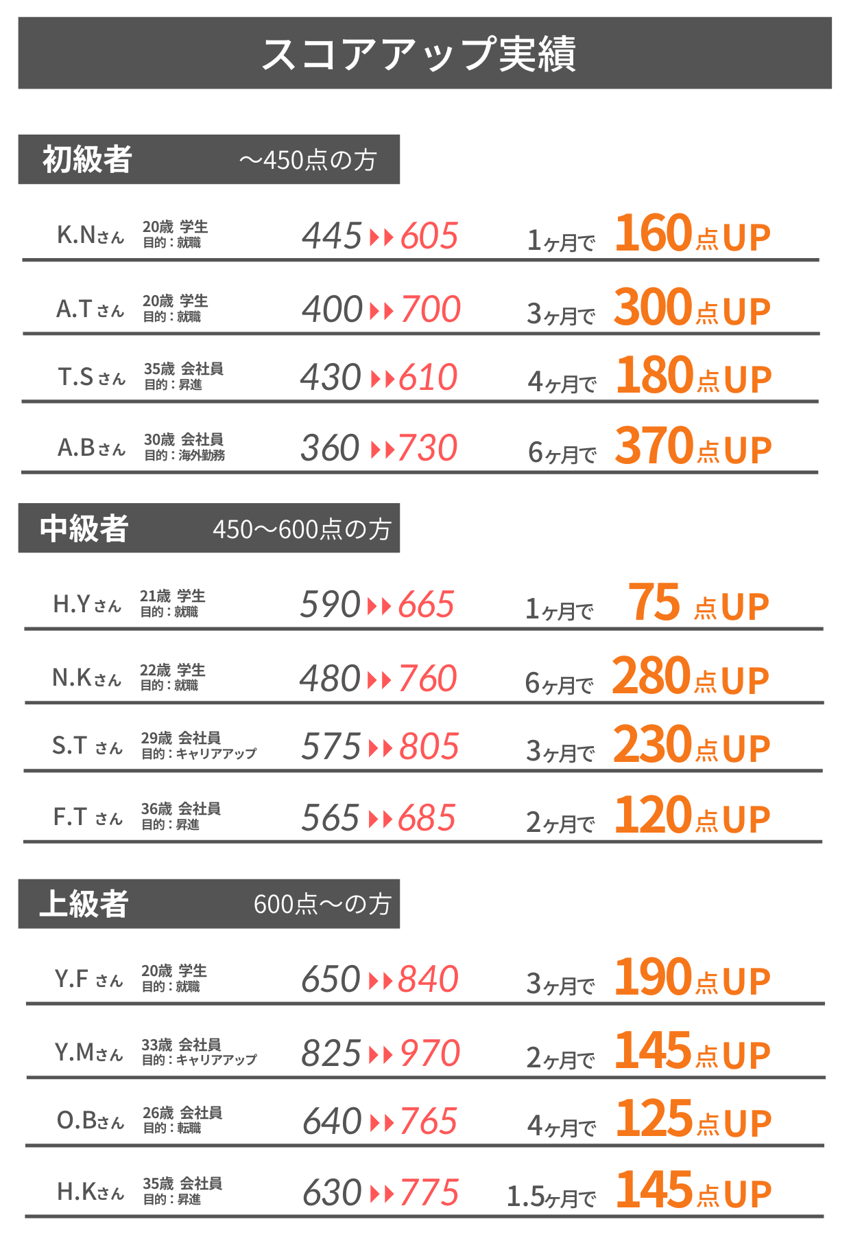 生徒様のレベルにあわせた指導を、同一の講師がスコアアップまでリードします。レッスンにプラス 課題・宿題で毎日の学習を積み重ねていきます。
